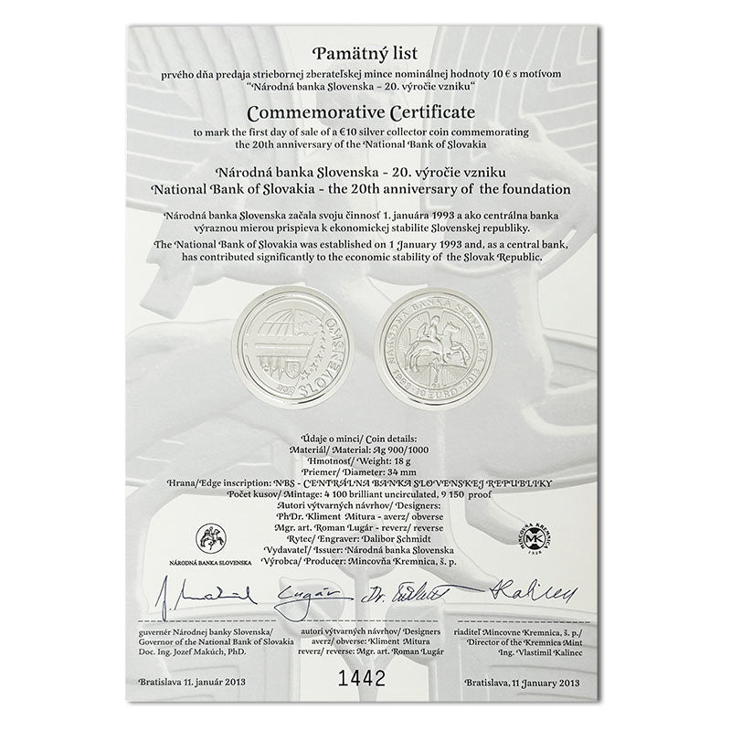Pamätný list prvého dňa predaja striebornej zberateľskej mince nominálnej hodnoty 10 euro s motívom ''Národná banka Slovenska – 20. výročie vzniku''.